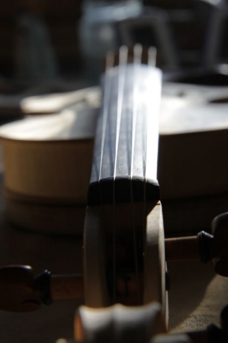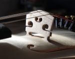 Nachdem die Oberfläche geschliffen, poliert und geölt ist und der Obersattel angeleimt ist zieht man die Saiten wieder auf und dann kanns losgehen mit dem Spielen... | |  | Steg aufschneiden Aus verschiedenen Gründen wird der alte Steg eines Streichinstrumentes durch einen neuen ersetzt: